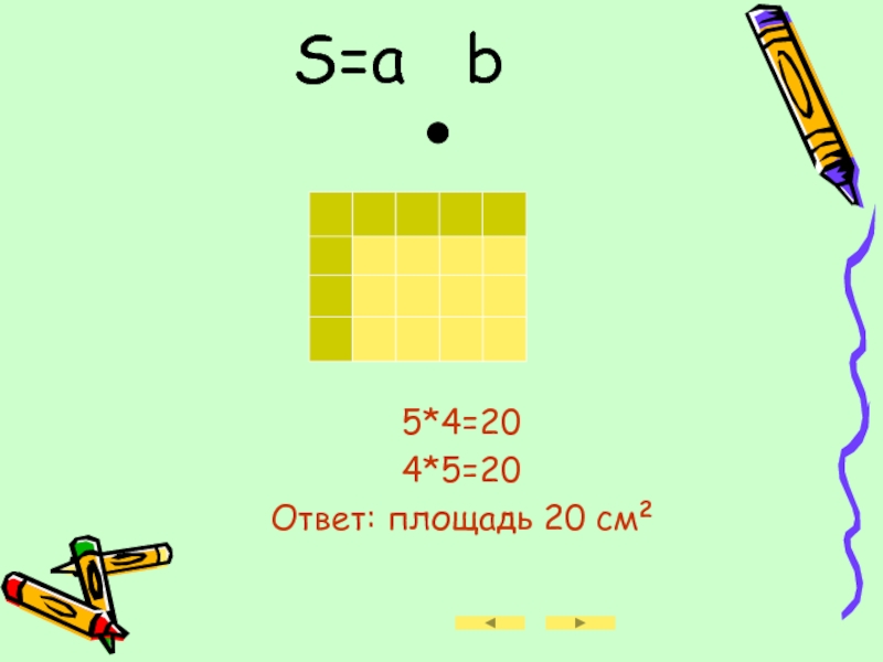 S=a  b5*4=204*5=20Ответ: площадь 20 см2