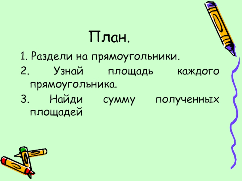 План.1. Раздели на прямоугольники.2. Узнай площадь каждого прямоугольника.3. Найди сумму полученных площадей