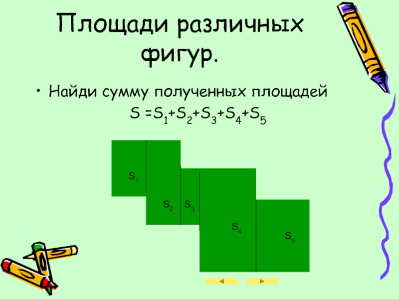 Площади различных фигур.Найди сумму полученных площадейS =S1+S2+S3+S4+S5S1S2S3S4S5