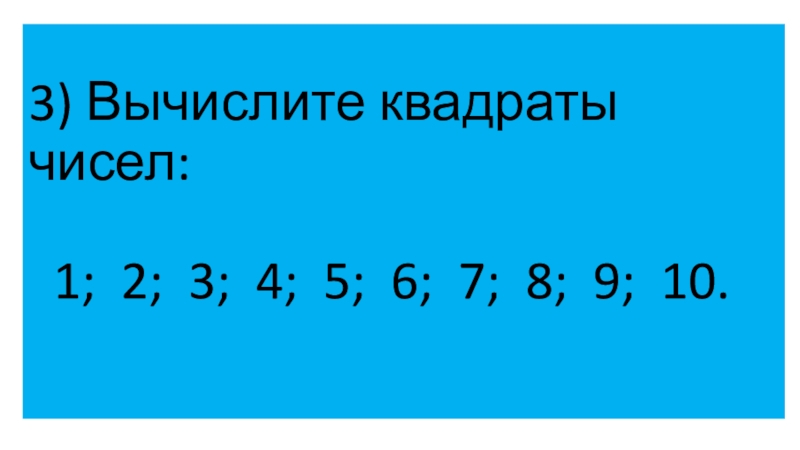 3) Вычислите квадраты чисел:   1; 2; 3; 4; 5; 6; 7; 8; 9; 10.