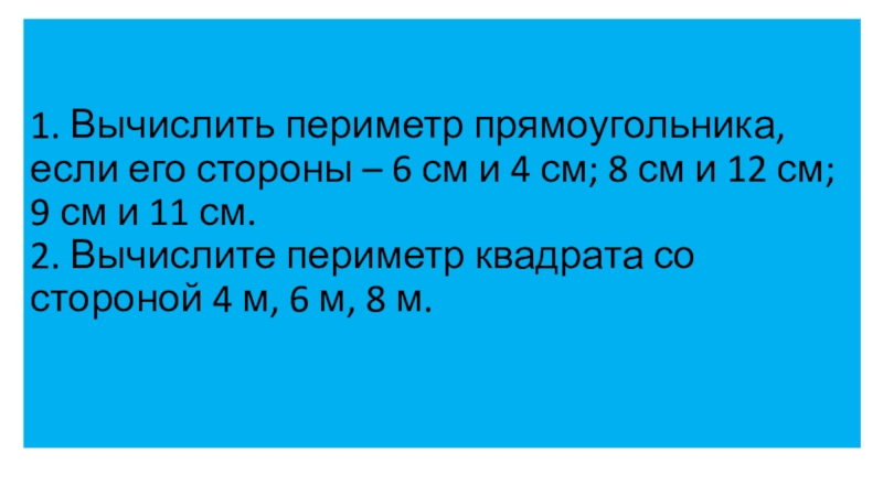 4 см; 8 см и 12 см; 9 см и 11 см. 2. Вычислите периметр квадрата со стороной 4 м, 6 м, 8 м.