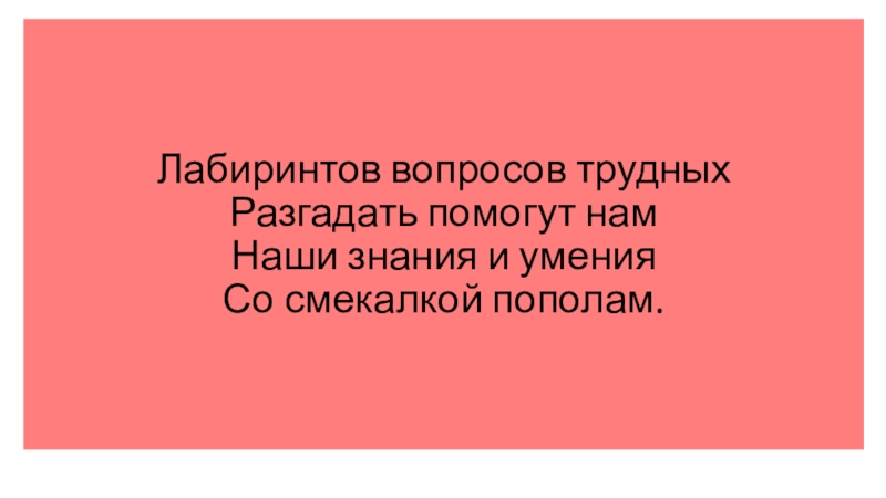 Слайд 2Лабиринтов вопросов трудных Разгадать помогут нам Наши знания и умения Со смекалкой пополам.