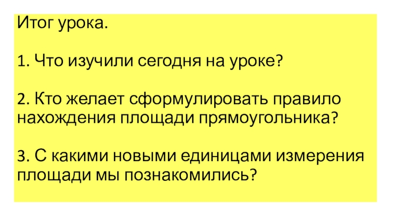 Итог урока.  1. Что изучили сегодня на уроке?  2. Кто желает сформулировать правило нахождения площади