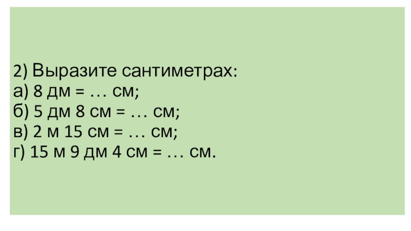 Слайд 52) Выразите сантиметрах: а) 8 дм = … см; б) 5 дм 8