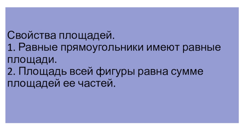 Свойства площадей. 1. Равные прямоугольники имеют равные площади. 2. Площадь всей фигуры равна сумме площадей ее частей.
