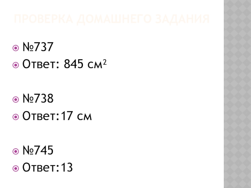 Проверка домашнего задания №737Ответ: 845 см²№738Ответ:17 см№745Ответ:13