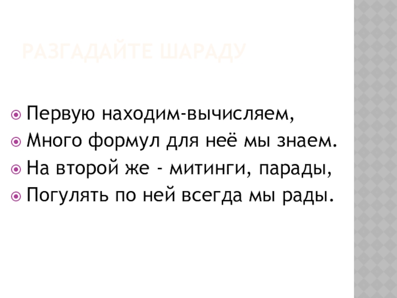 Разгадайте шарадуПервую находим-вычисляем,Много формул для неё мы знаем.На второй же - митинги, парады,Погулять по ней всегда мы