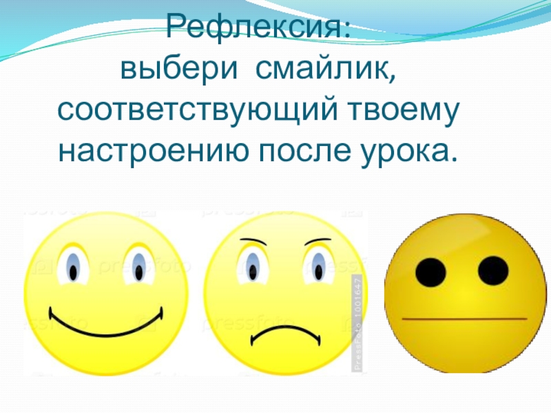Слайд 19Рефлексия: выбери смайлик, соответствующий твоему настроению после урока.