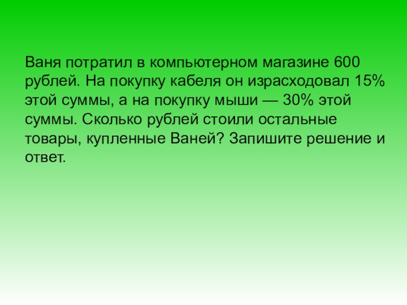 Ваня потратил в компьютерном магазине 600 рублей. На покупку кабеля он израсходовал 15% этой суммы, а на