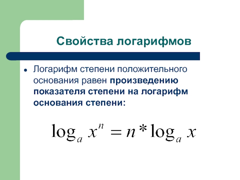 Свойства логарифмовЛогарифм степени положительного основания равен произведению показателя степени на логарифм основания степени: