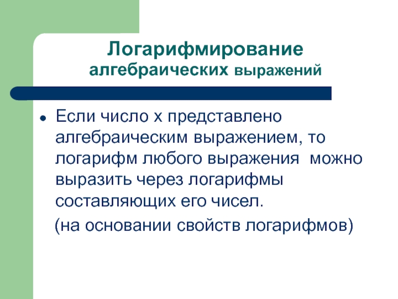 Логарифмирование  алгебраических выраженийЕсли число х представлено алгебраическим выражением, то логарифм любого выражения можно выразить через логарифмы