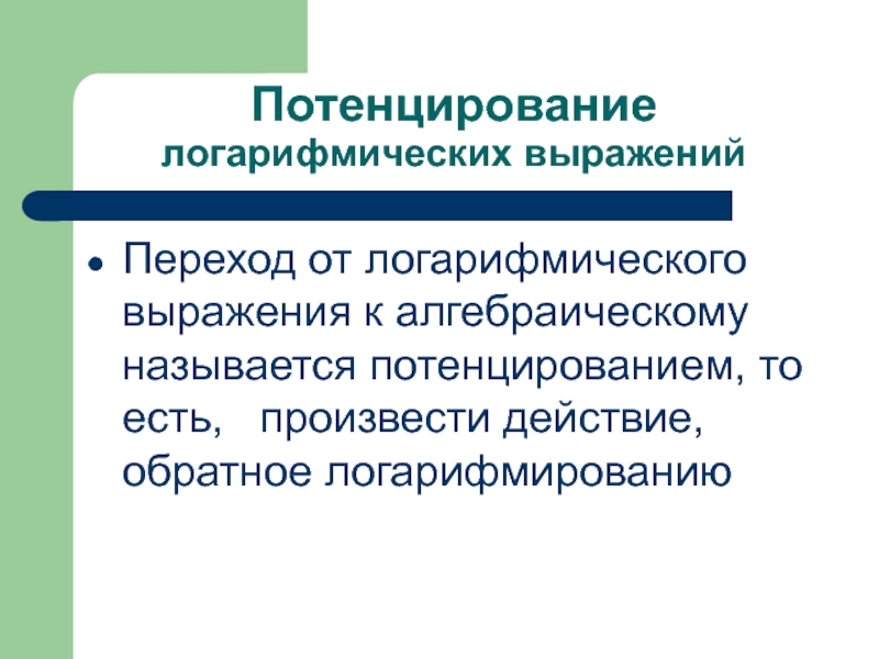 Потенцирование  логарифмических выраженийПереход от логарифмического выражения к алгебраическому называется потенцированием, то есть,  произвести действие, обратное