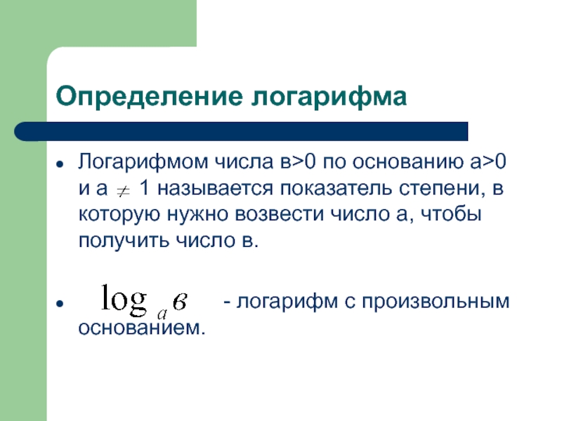 Определение логарифмаЛогарифмом числа в>0 по основанию а>0 и а   1 называется показатель степени, в которую