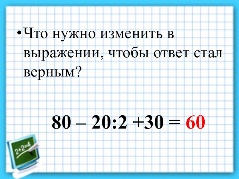 Что нужно изменить в выражении, чтобы ответ стал верным?80 – 20:2 +30 = 60