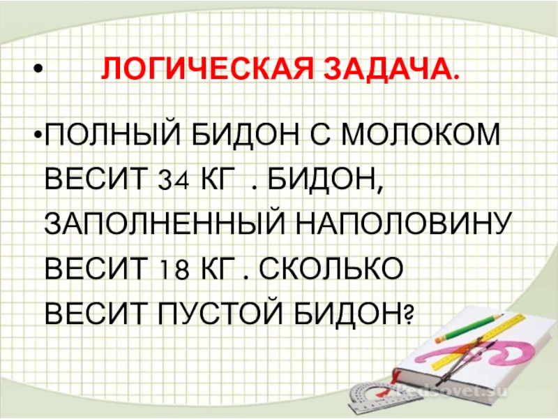 Логическая задача.Полный бидон с молоком весит 34 кг . бидон, заполненный наполовину весит