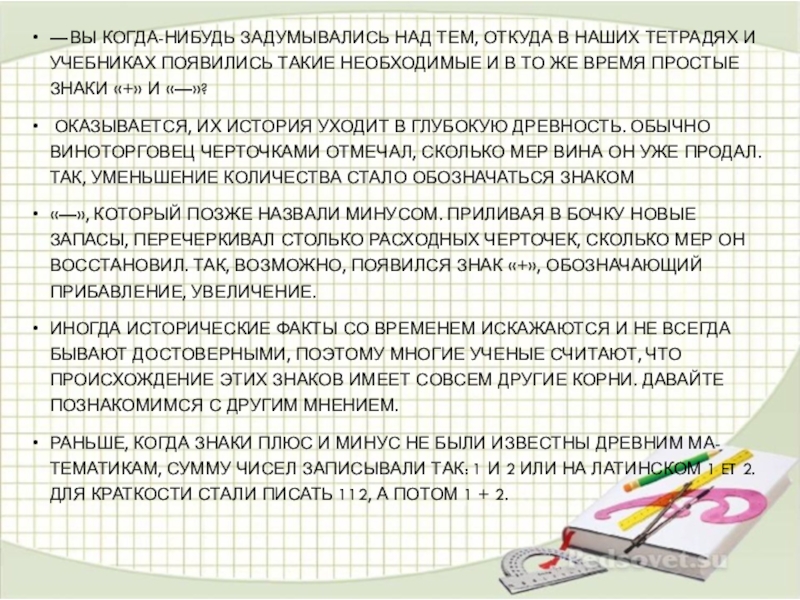 Раньше, когда знаки плюс и минус не были известны древним ма-тематикам, сумму чисел записывали так: 1 и 2 или на латинском 1 et 2. Для краткости стали писать 112, а потом 1 + 2.