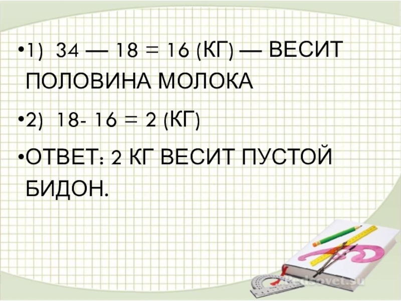 Слайд 31) 34 — 18 = 16 (кг) — весит половина молока