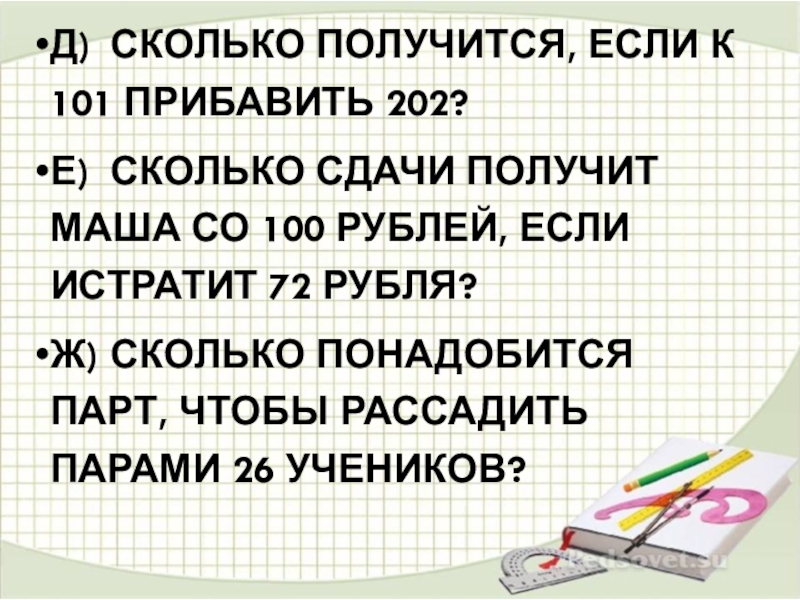 д)	Сколько получится, если к 101 прибавить 202?е)	Сколько сдачи получит Маша со 100 рублей, если истратит 72 рубля?ж)	Сколько