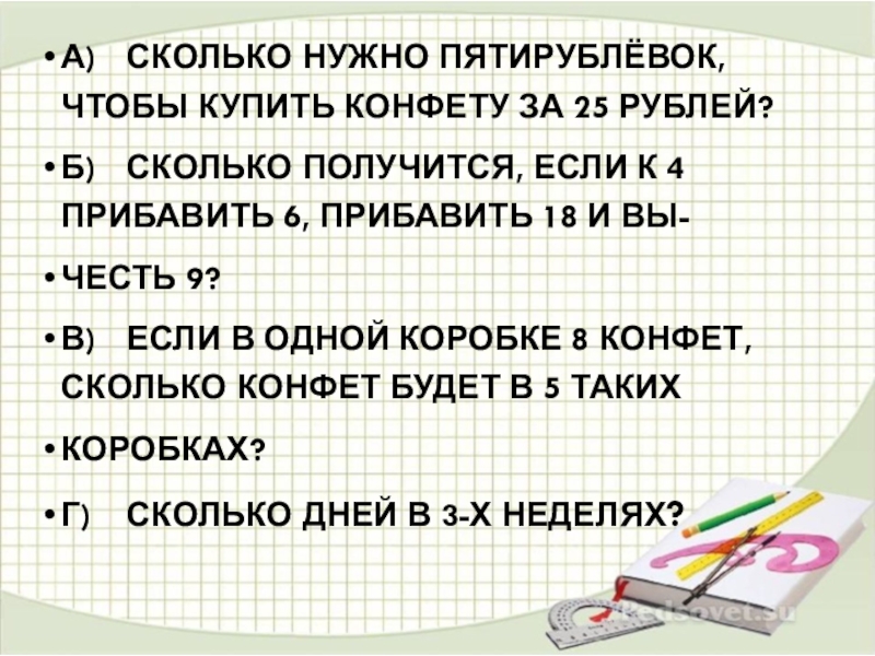 а)	Сколько нужно пятирублёвок, чтобы купить конфету за 25 рублей?б)	Сколько получится, если к 4 прибавить 6, прибавить 18