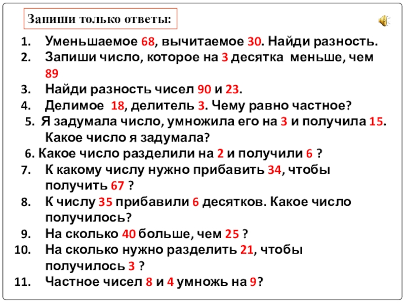 Запиши только ответы:Уменьшаемое 68, вычитаемое 30. Найди разность.Запиши число, которое на 3 десятка меньше, чем 89Найди разность