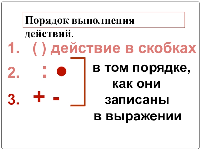 Порядок выполнения действий.( ) действие в скобках  : ● + - в том порядке,