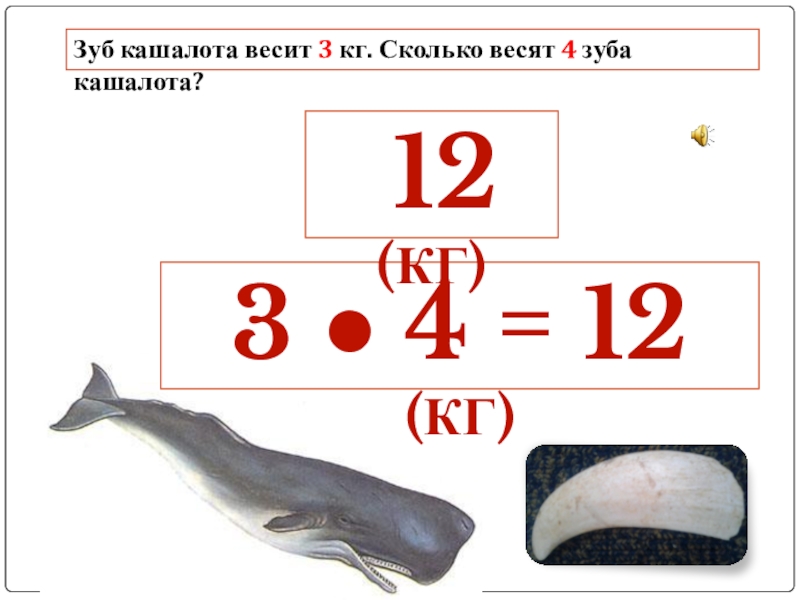 Зуб кашалота весит 3 кг. Сколько весят 4 зуба кашалота?3 ● 4 = 12 (КГ) 12 (КГ)