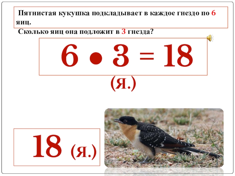Пятнистая кукушка подкладывает в каждое гнездо по 6 яиц. Сколько яиц она подложит в 3 гнезда?
