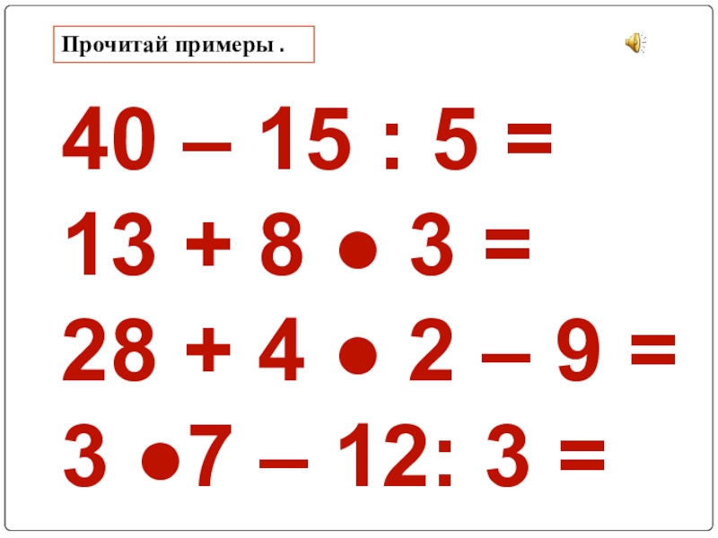 Прочитай примеры .40 – 15 : 5 =13 + 8 ● 3 =28 + 4 ● 2 – 9 =3 ●7 – 12: 3 =