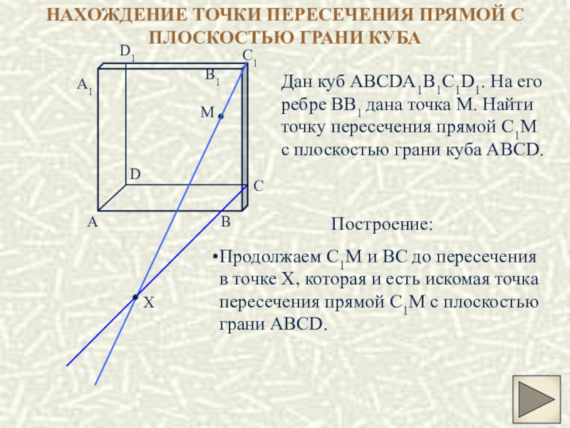 Продолжаем C1M и BC до пересечения в точке X, которая и есть искомая точка пересечения прямой C1M с плоскостью грани ABCD.