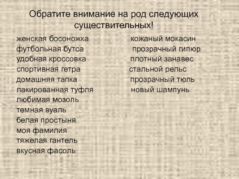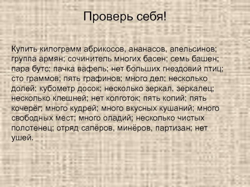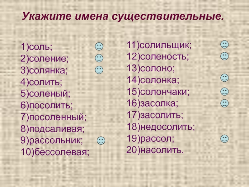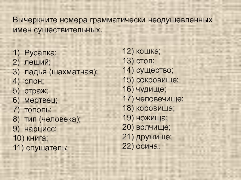 Слайд 13Вычеркните номера грамматически неодушевленных имен существительных.