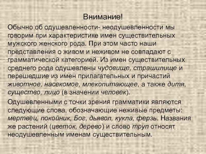 Одушевленными с точки зрения грамматики являются следующие слова, обозначающие неживые предметы: мертвец, покойник, Бог, дьявол, кукла, ферзь. Названия же растений (цветок, дерево) и слово труп относят неодушевленным именам существительным.
