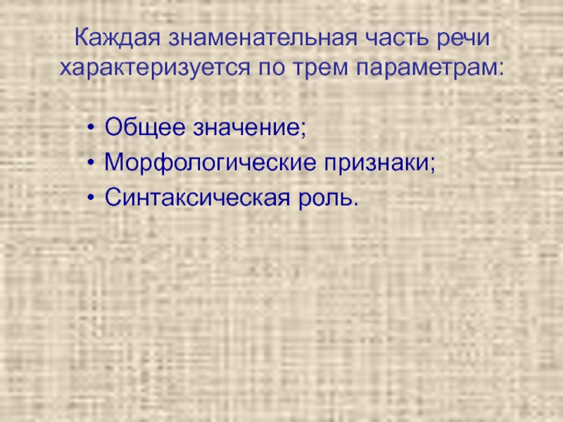 Слайд 3Каждая знаменательная часть речи характеризуется по трем параметрам: