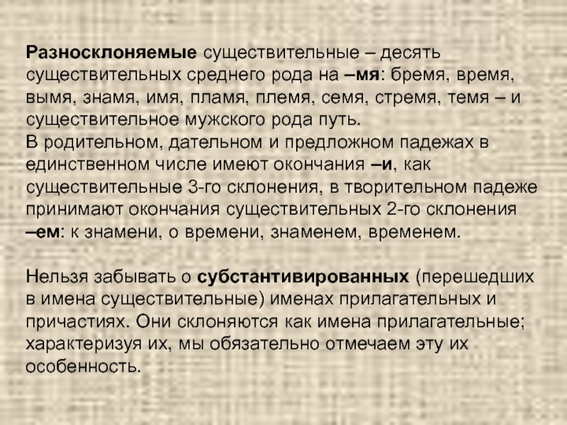 Слайд 32Разносклоняемые существительные – десять существительных среднего рода на –мя: бремя, время,