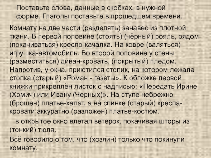 Комнату на две части (разделять) занавес из плотной ткани. В первой половине (стоять) (чёрный) рояль, рядом (покачиваться) кресло-качалка. На ковре (валяться) игрушка-автомобиль. Во второй половине у стены (разместиться) диван-кровать, (покрытый) пледом. Напротив, у окна, приютился столик, на котором лежала стопка (старый) «Роман - газеты». К обложке первой книжки прикреплён листок с надписью: «Передать Ирине (Хомич) или Ивану (Черных)». На стуле небрежно (брошен) платье-халат, а на спинке (старый) кресла-кровати аккуратно (разложен) платье-костюм.