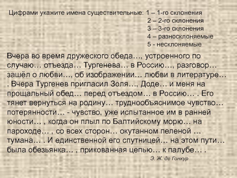Вчера во время дружеского обеда…, устроенного по случаю… отъезда… Тургенева… в Россию…, разговор… зашёл о любви…, об изображении… любви в литературе… . Вчера Тургенев пригласил Золя…, Доде… и меня на прощальный обед… перед отъездом… в Россию… . Его тянет вернуться на родину… труднообъяснимое чувство… потерянности… - чувство, уже испытанное им в ранней юности… , когда он плыл по Балтийскому морю… на пароходе… , со всех сторон… окутанном пеленой … тумана… . И единственной его спутницей… на этом пути… была обезьянка… , прикованная цепью… к палубе… .