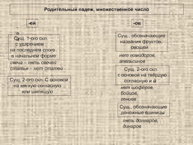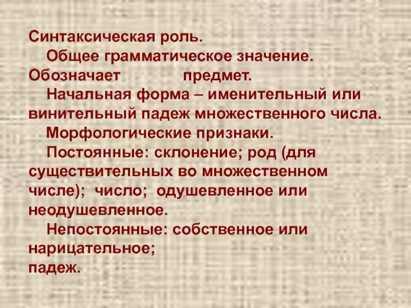 Постоянные: склонение; род (для существительных во множественном числе); число; одушевленное или неодушевленное.