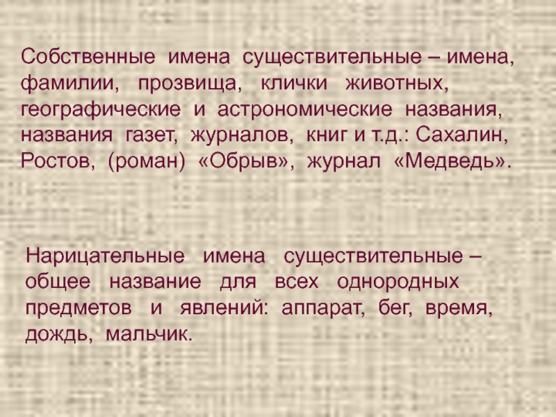 Слайд 10Собственные имена существительные – имена, фамилии, прозвища, клички