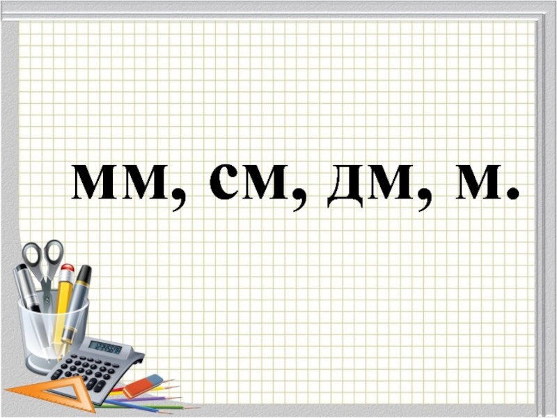 Единицы измерения длиныМетр (м)Сантиметр (см)Миллиметр (мм)Дециметр (дм)