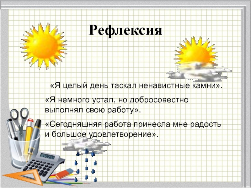 Рефлексия«Я целый день таскал ненавистные камни».«Я немного устал, но добросовестно выполнял свою работу».«Сегодняшняя работа принесла мне радость