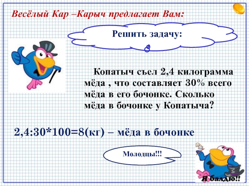 2,4:30*100=8(кг) – мёда в бочонке