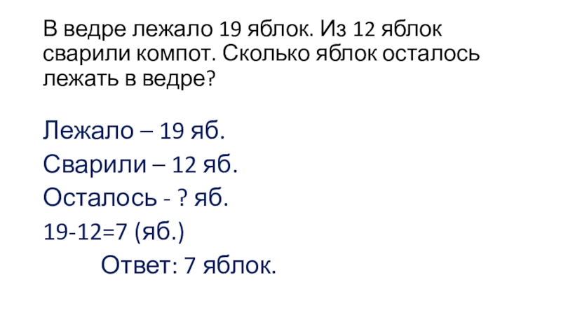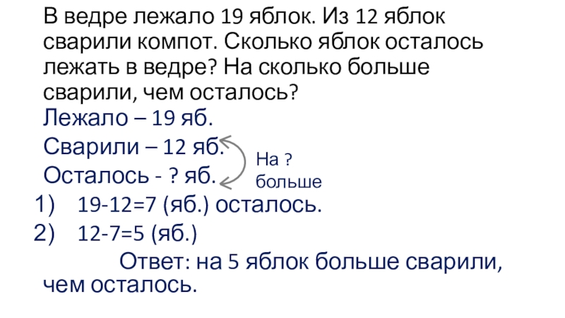 В ведре лежало 19 яблок. Из 12 яблок сварили компот. Сколько яблок осталось лежать в ведре? На сколько больше сварили, чем осталось?