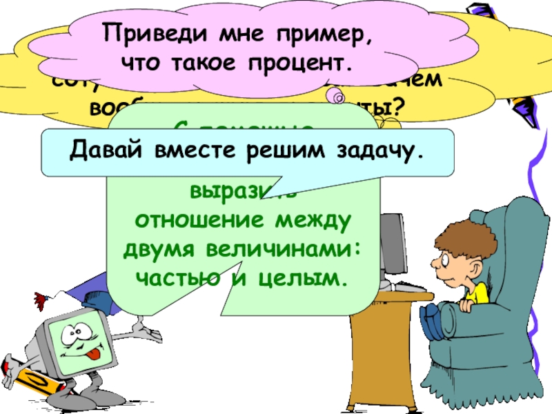 С помощью процентов можно выразить отношение между двумя величинами: частью и целым.