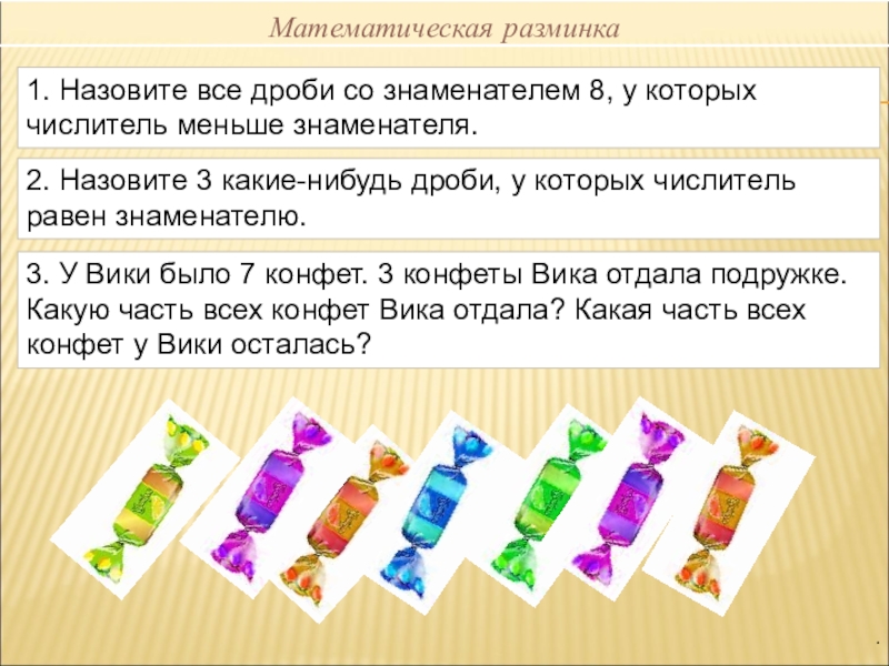 3. У Вики было 7 конфет. 3 конфеты Вика отдала подружке. Какую часть всех конфет Вика отдала? Какая часть всех конфет у Вики осталась?