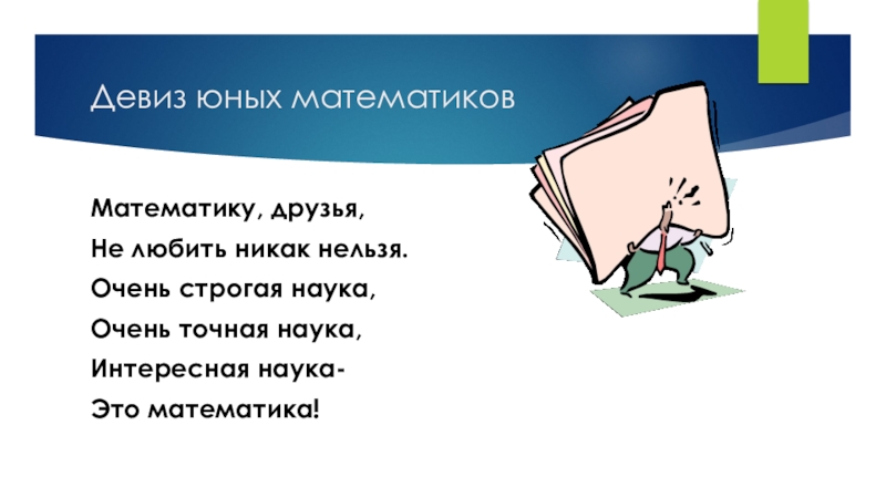 Девиз юных математиковМатематику, друзья,Не любить никак нельзя.Очень строгая наука,Очень точная наука, Интересная наука- Это математика!
