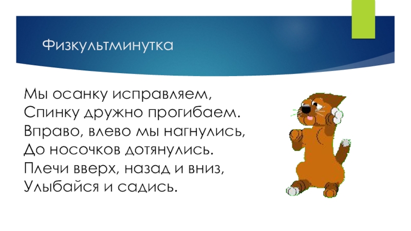 ФизкультминуткаМы осанку исправляем,Спинку дружно прогибаем.Вправо, влево мы нагнулись,До носочков дотянулись.Плечи вверх, назад и вниз, Улыбайся и садись.