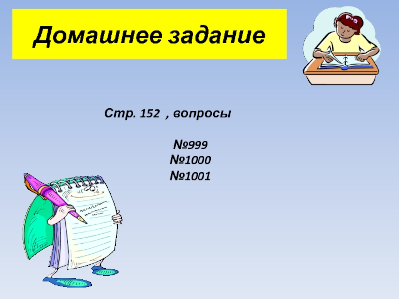Домашнее заданиеСтр. 152 , вопросы№999№1000№1001