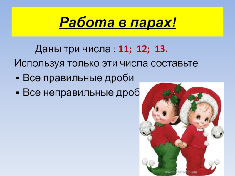 Работа в парах!     Даны три числа : 11; 12; 13.Используя только эти числа