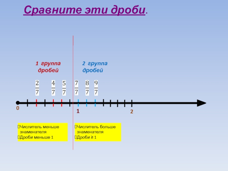 Сравните эти дроби.021 группадробей2 группа дробейЧислитель меньше знаменателяДроби меньше 1Числитель больше знаменателяДроби ≥ 1