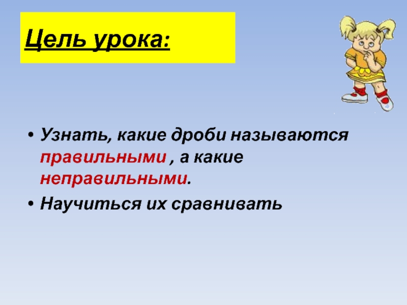 Цель урока:Узнать, какие дроби называются правильными , а какие неправильными.Научиться их сравнивать