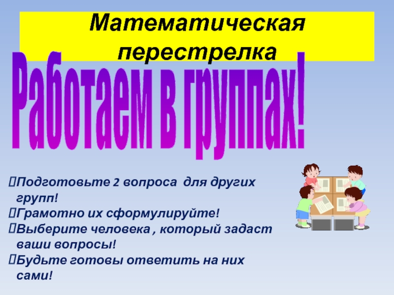 Математическая перестрелкаРаботаем в группах!Подготовьте 2 вопроса для других групп!Грамотно их сформулируйте!Выберите человека , который задаст ваши вопросы!Будьте